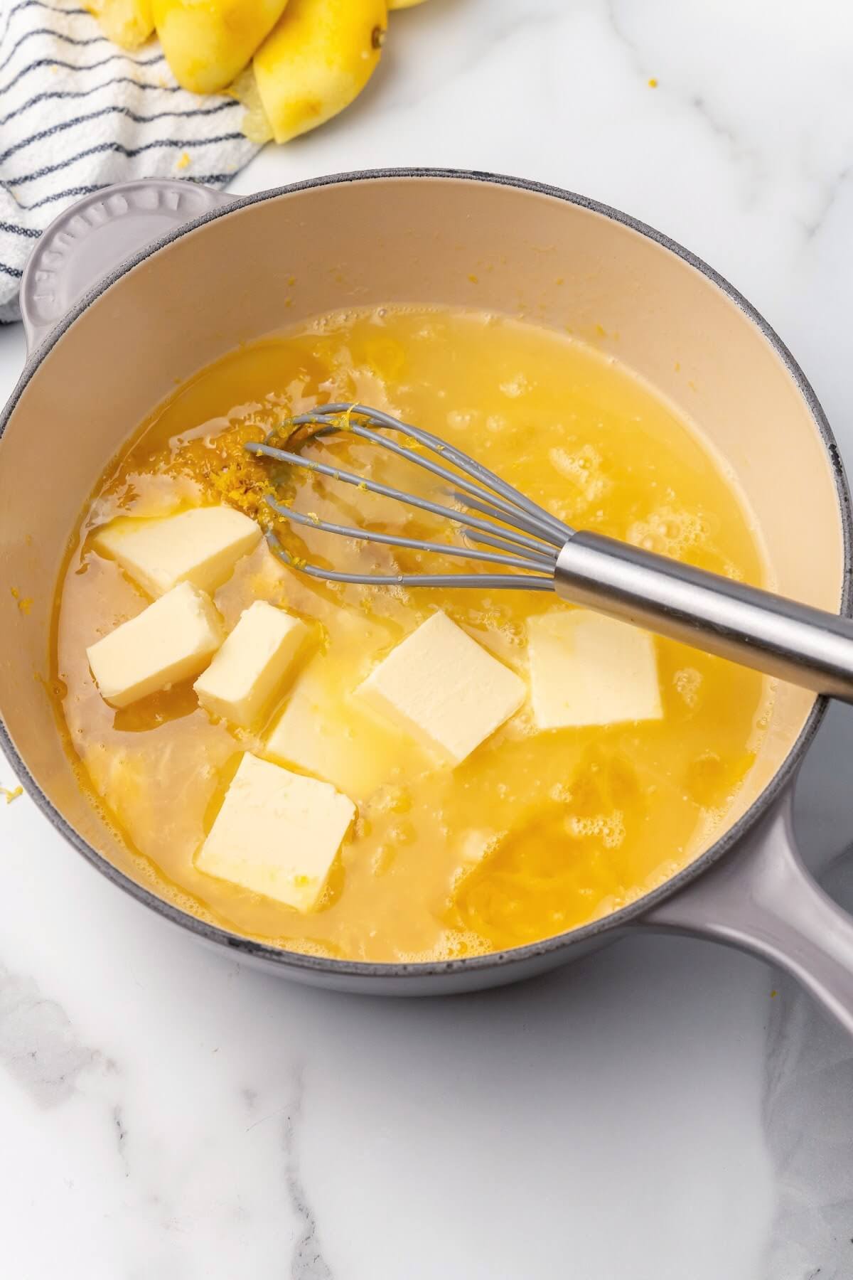 - In a heavy-bottomed medium saucepan, add the eggs and honey. Then use a whisk to combine the best you can. Next add the lemon zest, lemon juice and tablespoons of butter. Stir with a whisk the best you can to ensure the eggs don’t start to scramble (if they start to, don’t worry – you can strain those parts out in the end).