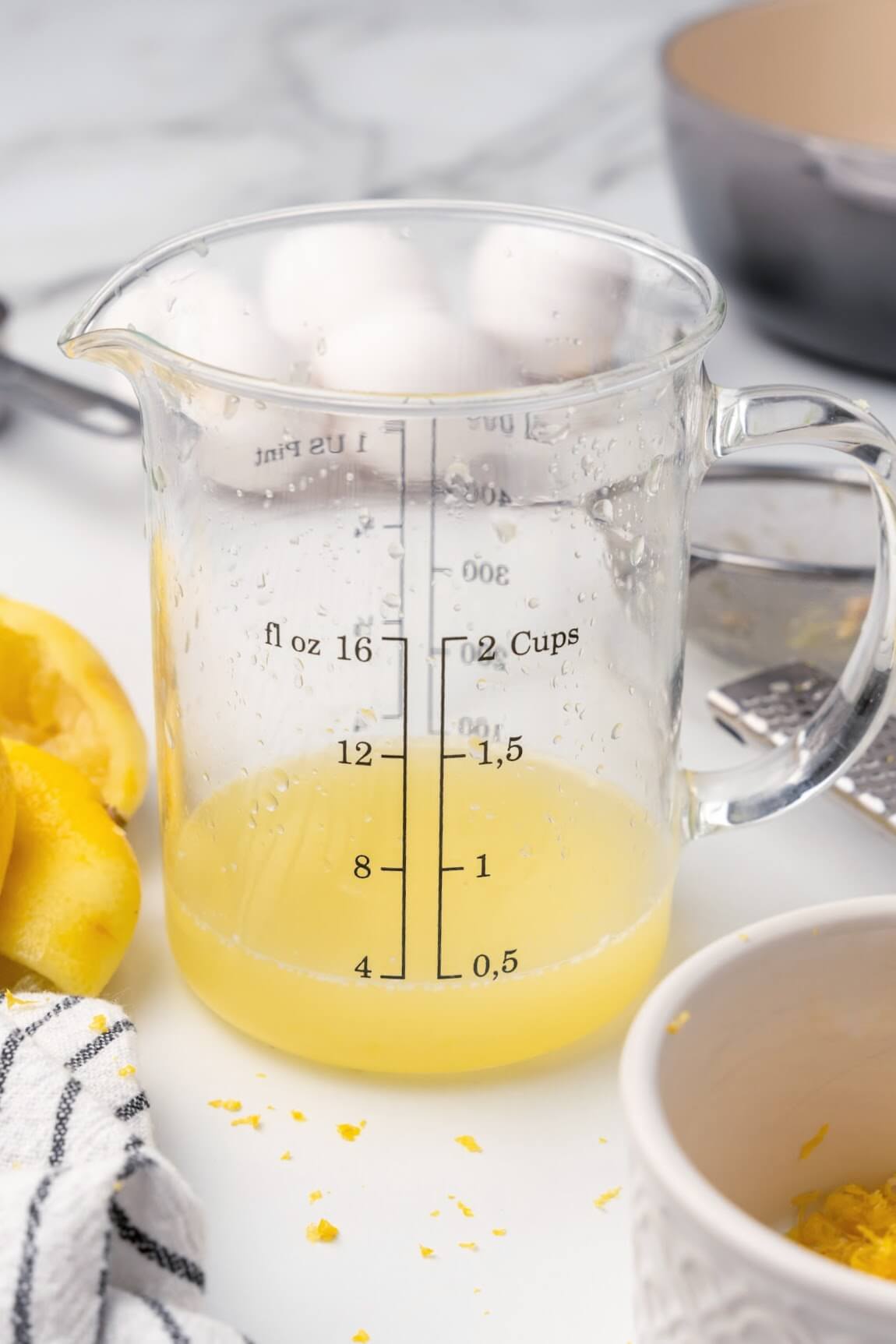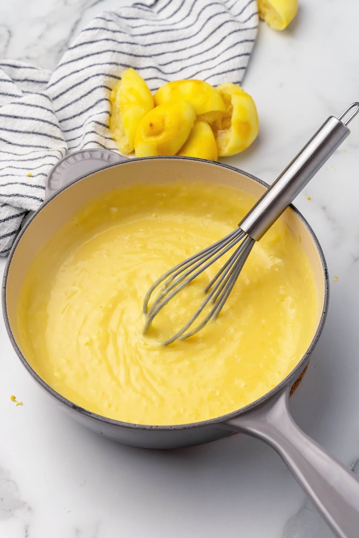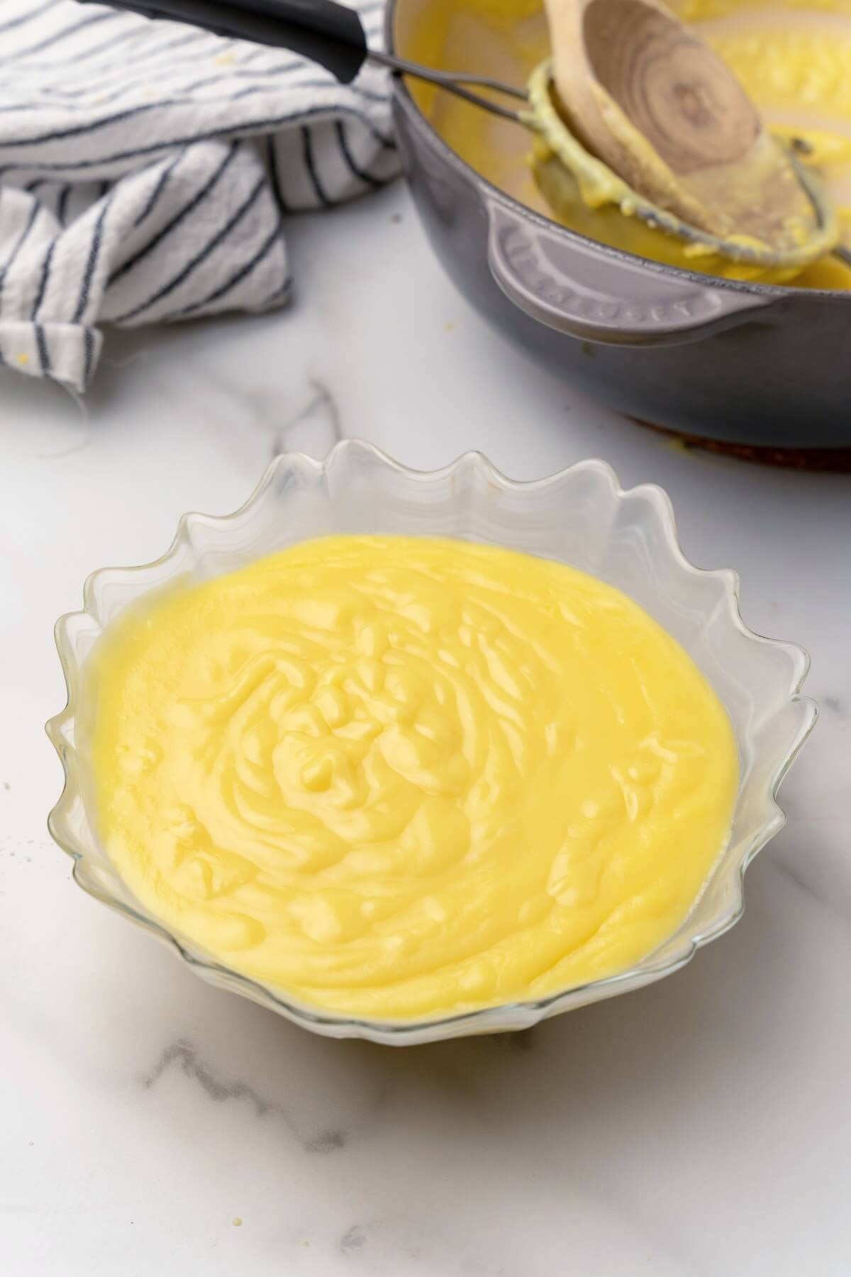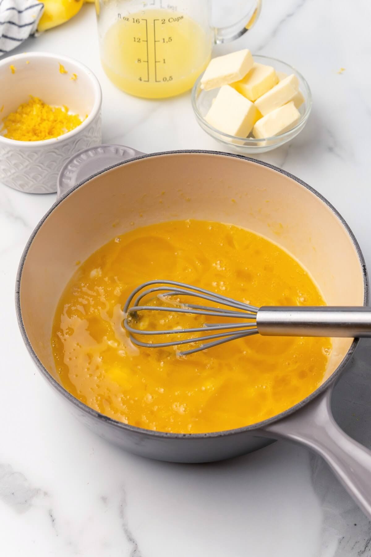 Equipment: Microplane Zester, Knife, Cutting Board, Handheld Lemon Squeezer (optional), Fine Mesh Strainer, Glass Measuring Cup, Measuring Cups, Medium Heavy-Bottomed Saucepan, Whisk, Medium Heat-Safe Glass Bowl or Ramekins or Glass Custard Cups