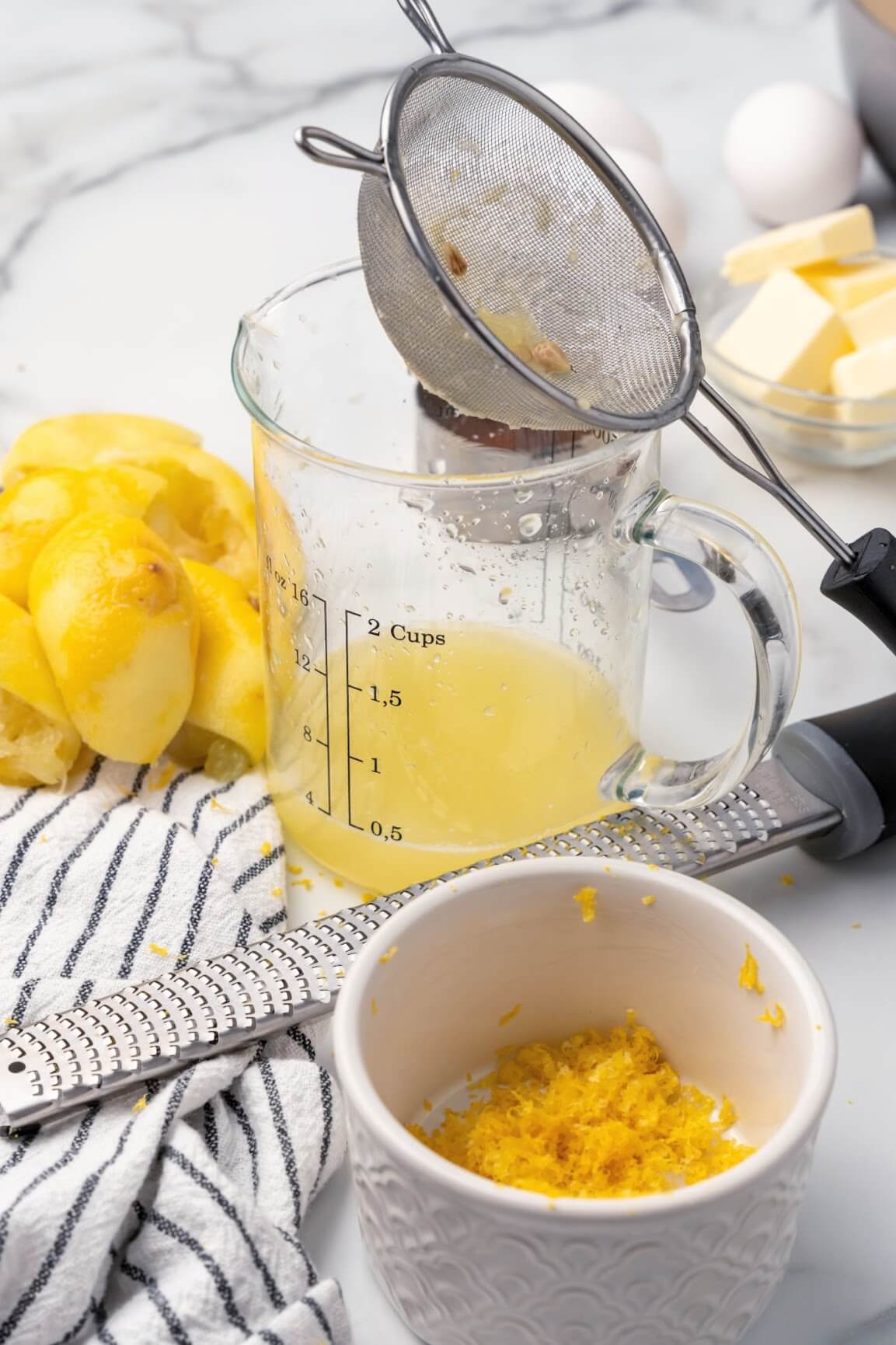 - Next, grab a cutting board and a chef’s knife and cut the lemons in half. If you have a handheld lemon squeezer, use this to make the lemon juice – it makes juicing lemons a breeze. Otherwise, use a fine mesh strainer over a glass measuring cup and juice the lemons by hand. Juice the lemons until you have ½ cup of juice, then set aside.