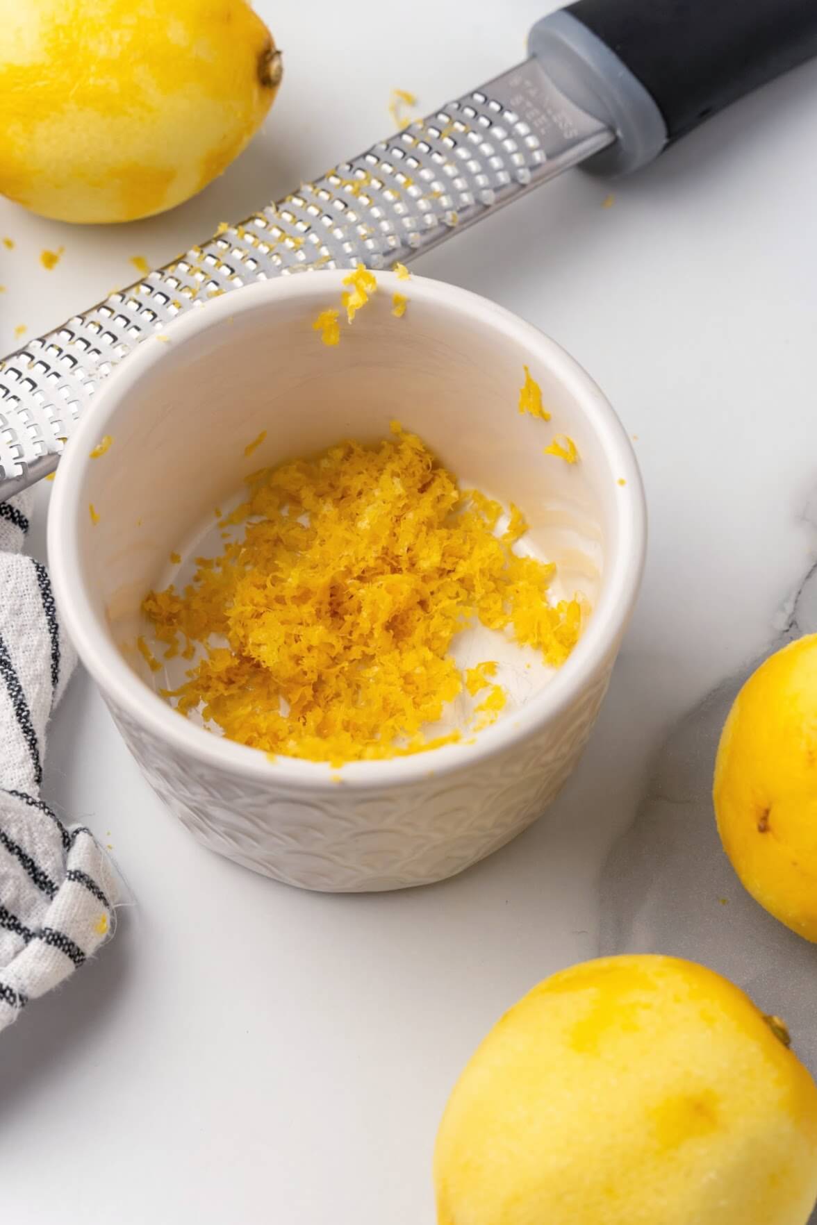 - Once you’ve washed and dried the lemons, use a microplane zester and zest the lemons, making sure to only zest the yellow part of the lemon peel/rind, not the inner white pith. Then set the lemon zest aside.