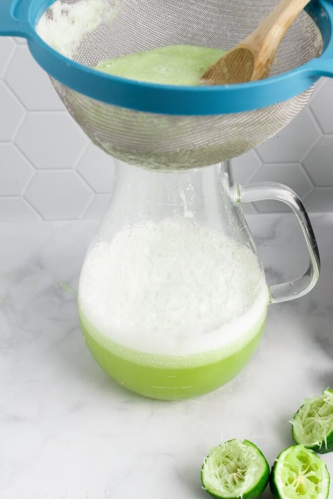 - Strain the agua fresca drink through a fine mesh strainer/sieve into a large glass pitcher with lid or 64-ounce (2 quart) mason jar, using a wooden spoon to gently press on the pulp to squeeze the remaining juice out, then discard the solids.