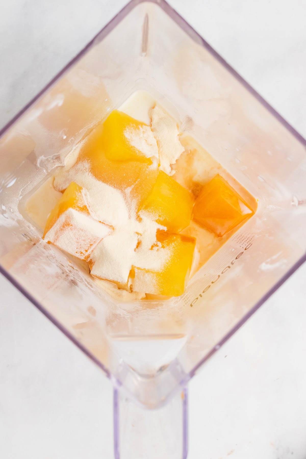 - When the orange juice ice cubes are frozen, add them to a blender followed by all of the remaining ingredients. Secure the blender lid and blend on high speed until the smoothie is smooth and fully combined.