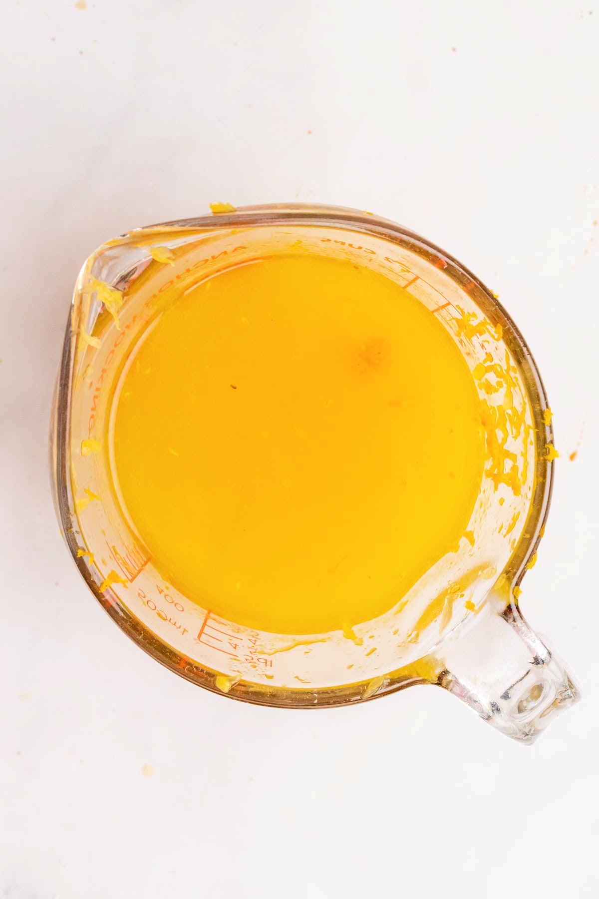 Once you’ve juiced the oranges, add the orange zest to a glass measuring cup and give it a quick stir. Then pour the freshly squeezed orange juice mixture into a BPA-free ice cube tray. Freeze the juice overnight until the juice is frozen.