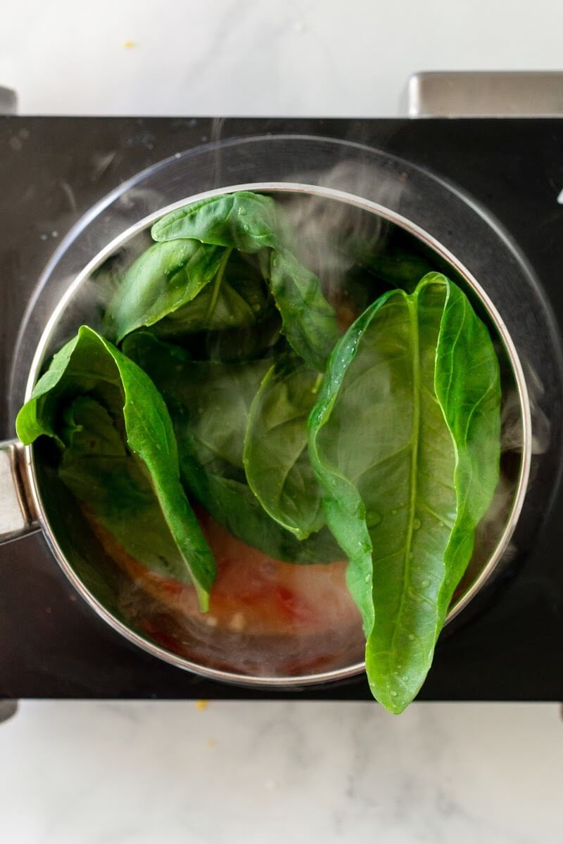 Cook for about 5 minutes, just until the cherry tomatoes start to break down. Then add the whole basil leaves to the sauce and give it several stirs until the basil leaves have slightly wilted into the sauce.