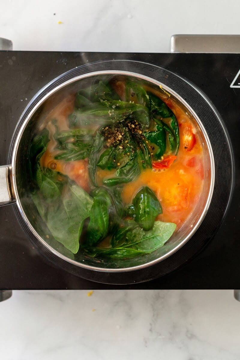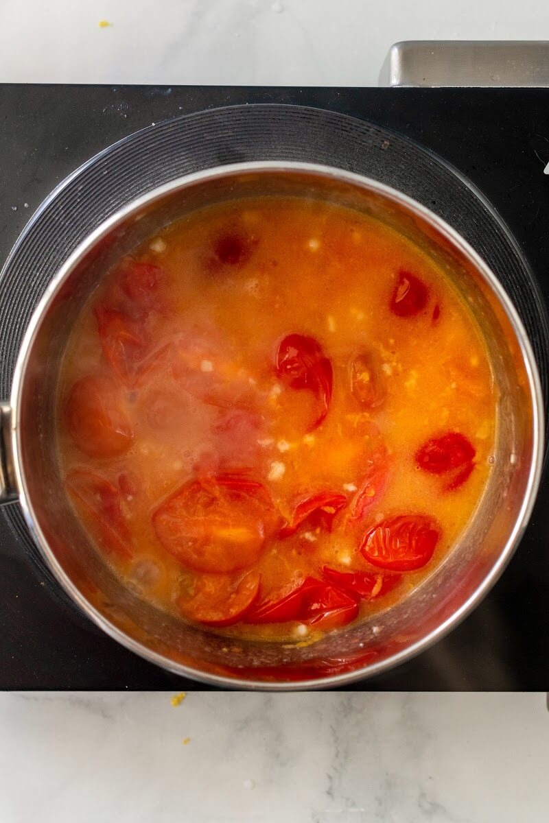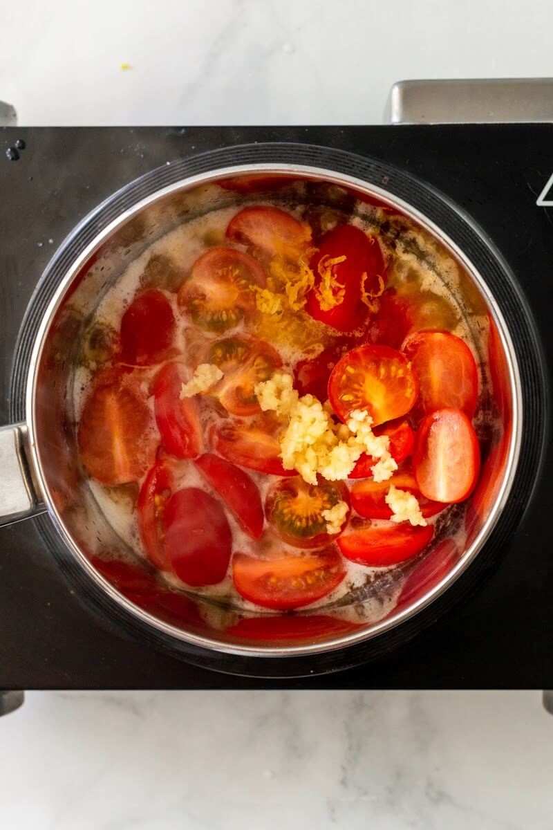 - In a medium saucepan over low heat, add the butter and allow to melt - this should take about 1 minute. Once the butter has melted, increase the heat to medium and add the tomatoes, garlic, lemon zest and lemon juice. Cook for about 5 minutes, just until the cherry tomatoes start to break down. Then add the whole basil leaves to the sauce and give it several stirs until the basil leaves have slightly wilted into the sauce.