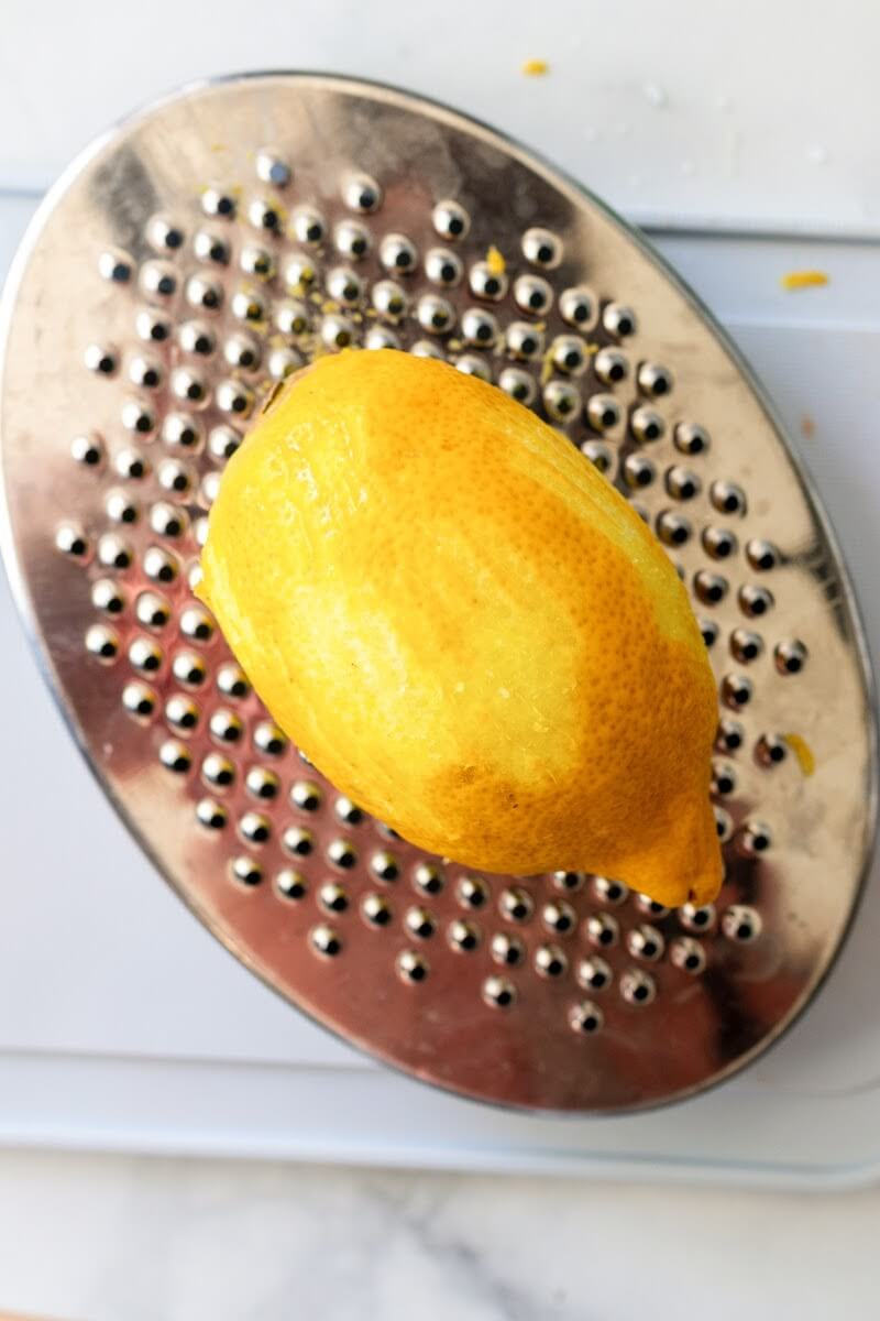Next, use a microplane or fine grater and zest the lemon - just the yellow part of the lemon peel/rind, not the inner white pith and set aside. Then cut the lemon in half and squeeze a few teaspoons of juice into a small bowl and set aside.